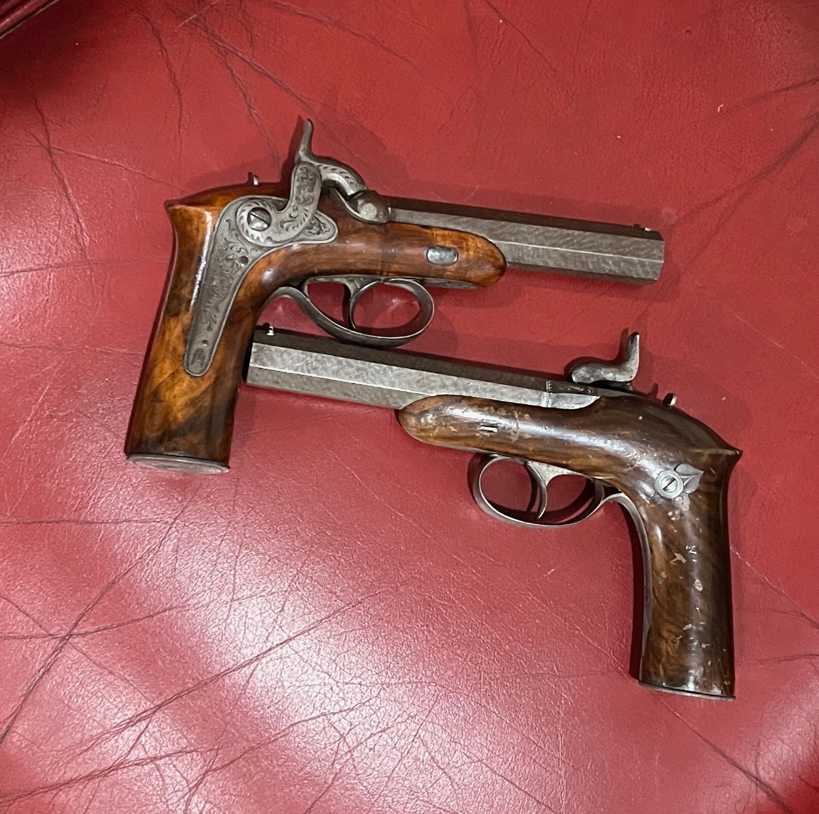 Matched pair of mid-19th-century percussion duelling pistols, each numbered “1” and “2” respectively.
